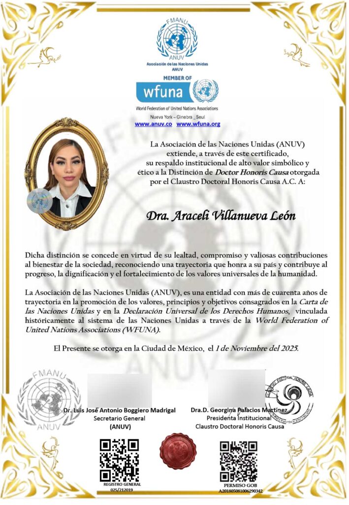 Nos honra compartir que la Dra. Araceli Villanueva León ha sido distinguida con el Doctorado Honoris Causa, otorgado por el Claustro Doctoral Honoris Causa A.C. y respaldado institucionalmente por la Asociación de las Naciones Unidas (ANUV), miembro de la World Federation of United Nations Associations (WFUNA).