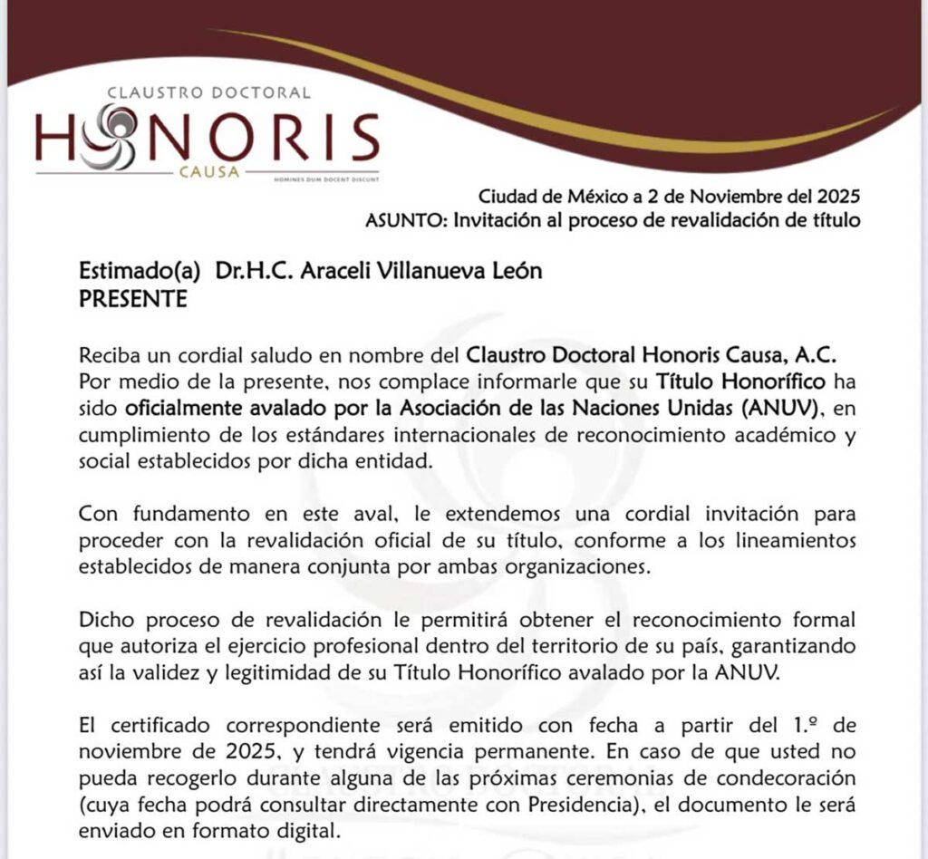 Este procedimiento confirma el cumplimiento de estándares internacionales en materia de reconocimiento académico y social, otorgando plena validez y legitimidad al nombramiento. La revalidación permitirá acreditar oficialmente el título dentro del territorio nacional, consolidando su vigencia y respaldo institucional.
